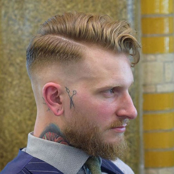 Popularmente conhecido como “lambido para trás” tem a divisão natural bem marcada na lateral o que dá um ar ainda mais retrô. Nas laterais você escolhe o comprimento, pode ser um fade terminando em zero (como na foto) ou um pouco mais alto.