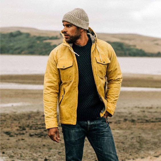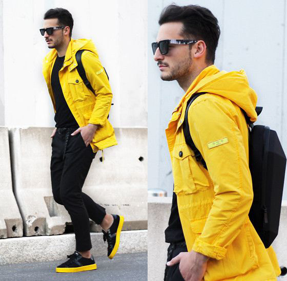 Outra tendência para este ano são as roupas com inspiração no workwear americano (mais aqui). Casacos com bolsos grandes e funcionais, jaquetas, parkas e workboots funcionam muito bem quando o amarelo predomina na peça.