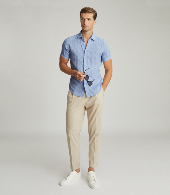 Você pode dar uma relaxada no slim fit e provar peças de linho com caimento mais solto, já que a ideia é fazer um look mais descontraído e relaxado, muitas vezes voltado para passeio ao ar livre.