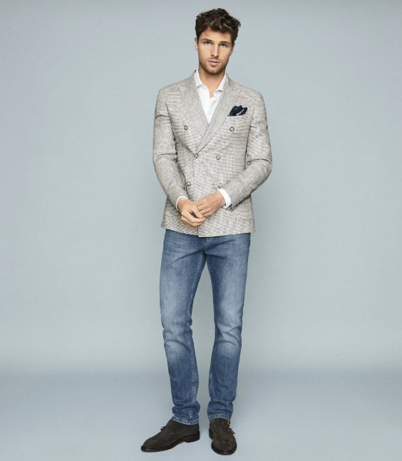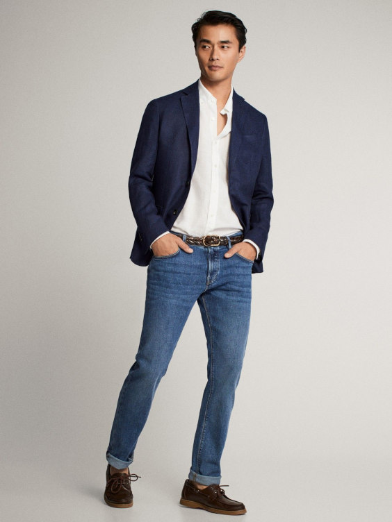 Os blazers de linho fazem um ótimo par com jeans escuros, principalmente quando a fibra está em seu tom mais cru, pois cria um bom contraste visual.