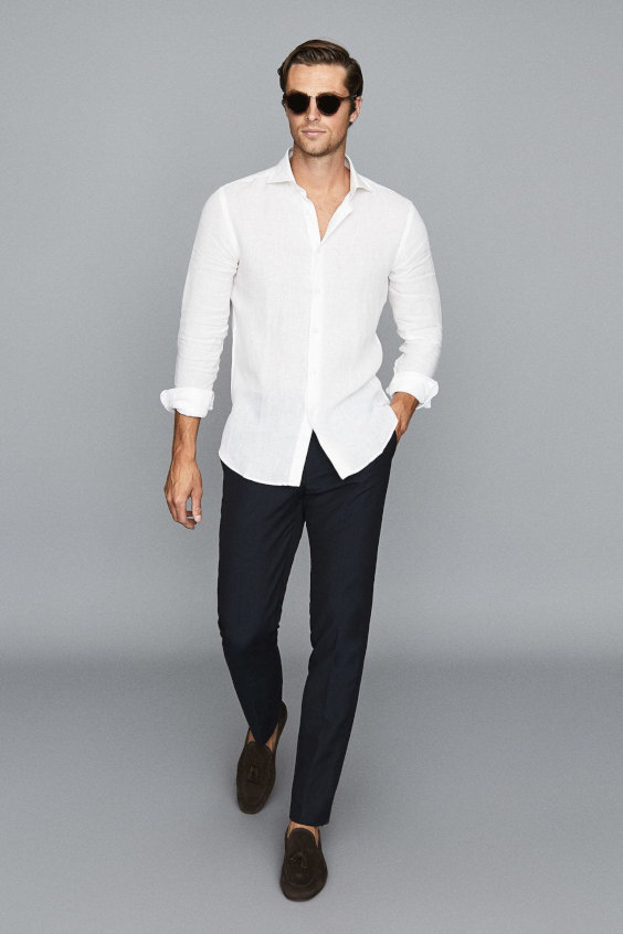 Para quem procura um visual mais equilibrado a dica é combinar o linho com outras peças casuais mas elegantes, como calças chino e sapatos tipo loafer, por exemplo.