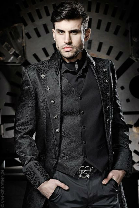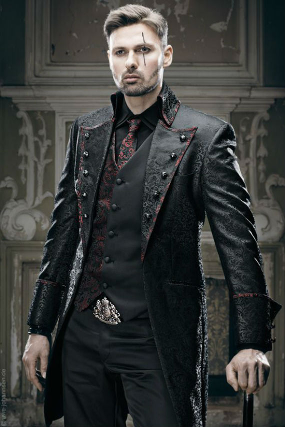 Assim, encontramos principalmente: calças de cortes retos, camisas de botão, colete, casaco e sobretudos. Para a cabeça, a tradicional cartola, boinas ferroviárias, quepes, barretes ou capacetes. Nos calçados, sapatos tradicionais, botas militares de couro envernizado, pele ou de borracha vulcanizada com o cano em comprimentos variados (desde as mais baixas até as de montaria que chegam quase aos joelhos).