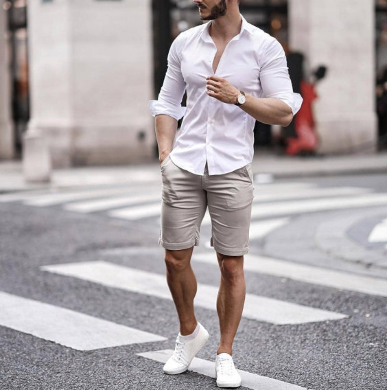 Um ideia simples e totalmente antenada com as tendências atuais de combinações de cores (o branco e bege) e as peças como a camiseta os shorts com cordão na cintura. Se preferir troque por uma bermuda chino ou taé uma calça de linho de tom cru, vai ficar ótimo. Nos pés, tênis brancos de lona, bem leves e despojados.