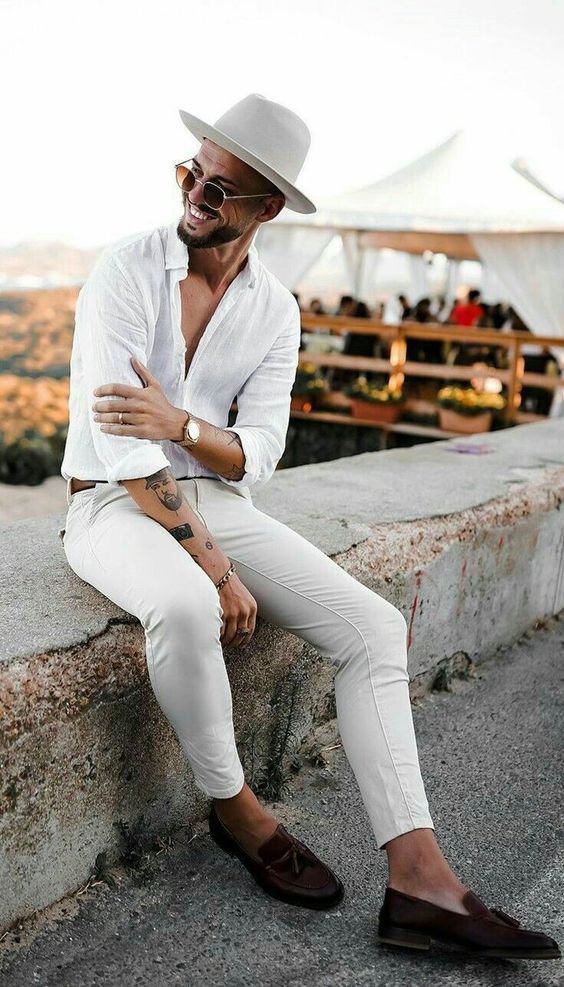 Neste ano as combinações de bege, branco e azul estão bombando nas redes sociais quando procuramos por roupas leves e looks masculinos para o Réveillon, mas você pode improvisar, aliás, acho fundamental dar o toque pessoal, seja com uma estampa diferentona ou simpelsmente fazendo uso de acessórios estilosos!