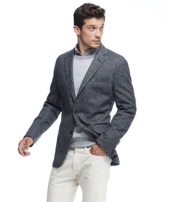 Mesclas – é comum encontrar blazers com tecido cinza mesclado, mas é importante que você saiba que a maioria deles trafega entre o super casual (moletom) e o ligeiramente casual (olho de perdiz) ou seja nunca serão tão sérios quanto um tecido liso ou falso liso. Aqui a escolha fica ligada ao tipo de estilo que você busca.