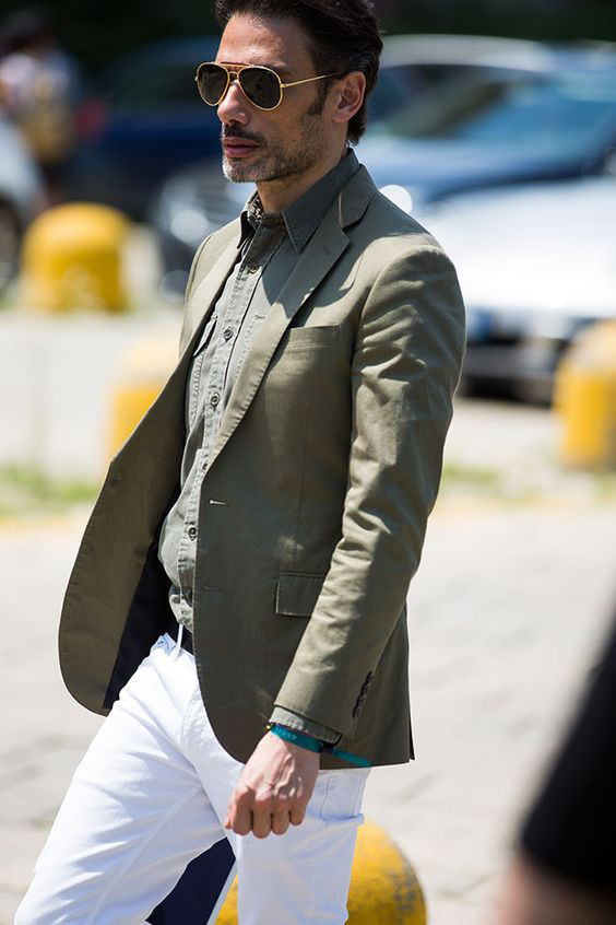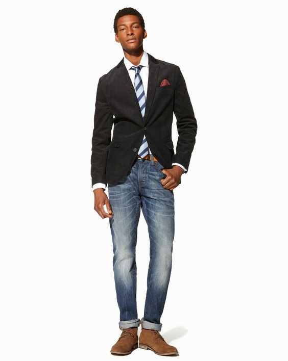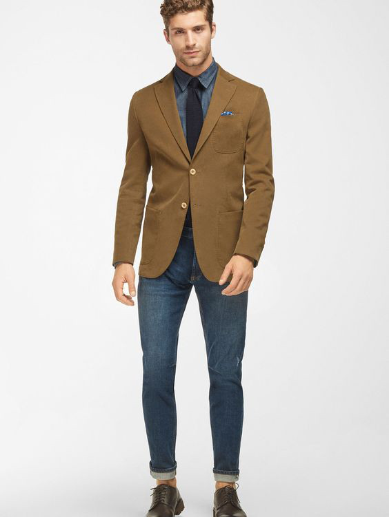 Camisas jeans ou de chambray combinam bem com o blazer de sarja masculino, pois ambas as peças tem seu “que” rústico, mas as vezes é melhor não exagerar, nesse caso é melhor equilibrar o visual com uma calça sofisticada (foto) ou um calçado ligeiramente mas sério.