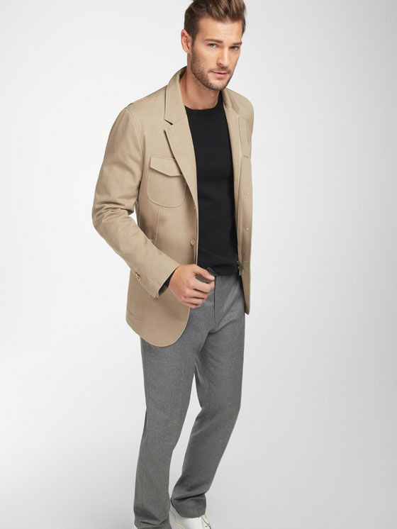 O blazer de sarja masculino é tão “relax” que você pode usá-lo com uma camisa casual por fora da calça sem parecer desleixado, apenas certifique-se que a camisa não é mais longa que o casaco, sobretudo na parte de trás.