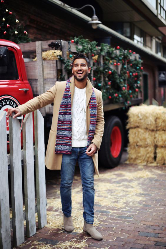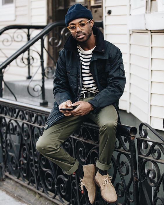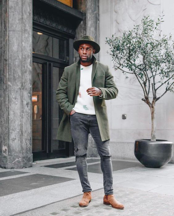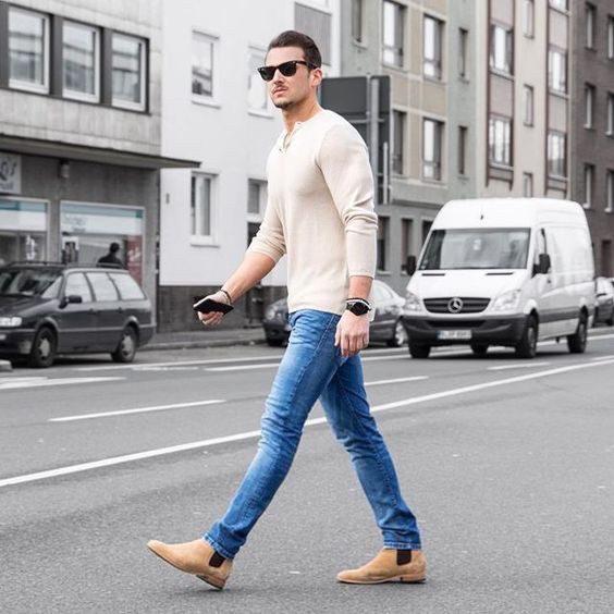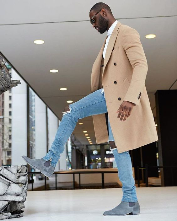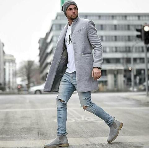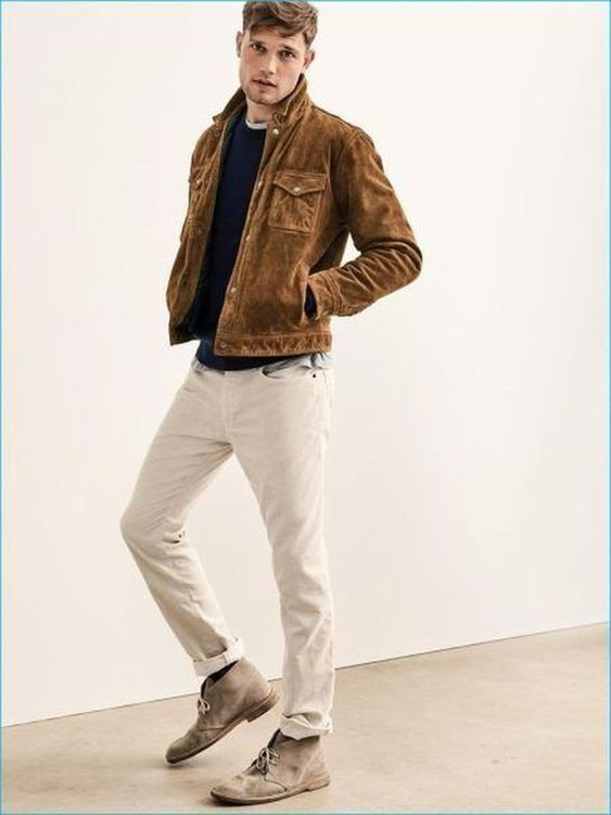 Com os tons escuros das roupas de inverno, as botas de camurça clara vem justamente para dar o contraste, embora muitos homens tenham optado por combiná-las com alguma peça que esteja cobrindo o dorso, enquanto a calça fica em um tom mais sóbrio ou até mesmo o preto.