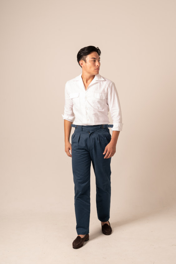 A calça Gurkha não tem passantes para cinto, já que sua cintura é ajustável, mas, curiosamente, algumas delas apresentam os botões usados para prender suspensórios, o que me parece redundante, embora tenha seus adeptos.