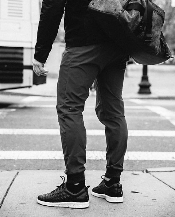 Misturar elementos esportivos com a camisa um pouco mais alinhada é plenamente possível, já que a calça acaba fazendo o meio de campo com seu estilo entre a chino e o moletom. Usar uma única cor e variar os tons também ajuda muito, pois evita que o look fique muito chamativo.