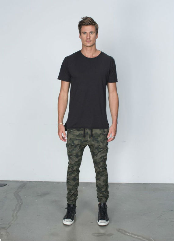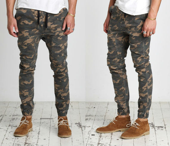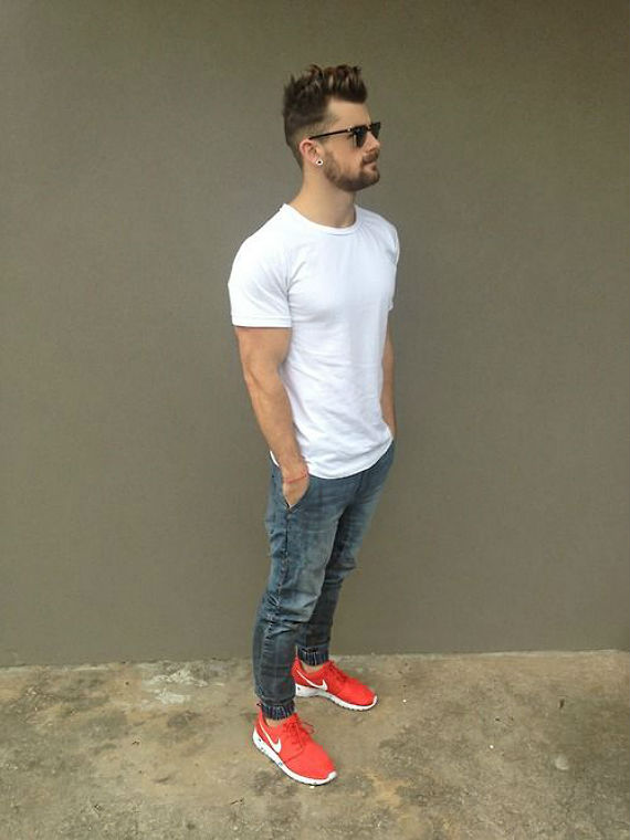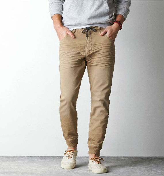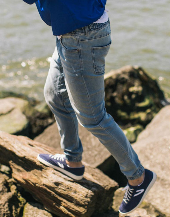 Calçados – Nos pés as opções só não permitem sapatos sociais, pois destoariam do estilo da jogger, mas por outro lado temos uma boa parceria entre a peça e tênis de cano alto, baixo, esportivos, casuais, de lona, de couro e de nylon, tanto quanto calçados mais pesados como desert boots, work boots e até coturnos. No caso dos tênis o mais aconselhável é optar pelo uso sem meia, entretanto há quem use-as, aproveitando um par listrado bem colorido e divertido. Para as botas o ideal é que o elástico se esconda dentro do cano ou, pelo menos, não deixa as canelas a mostra.