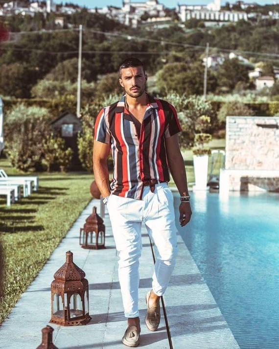 O modelo de camisa da foto abusa do contraste e das listras grossas, portanto escolha calças que sejam neutras para não pesar o visual. Loafers são uma escolha elegante, mas na praia você pode apelar para sandálias.