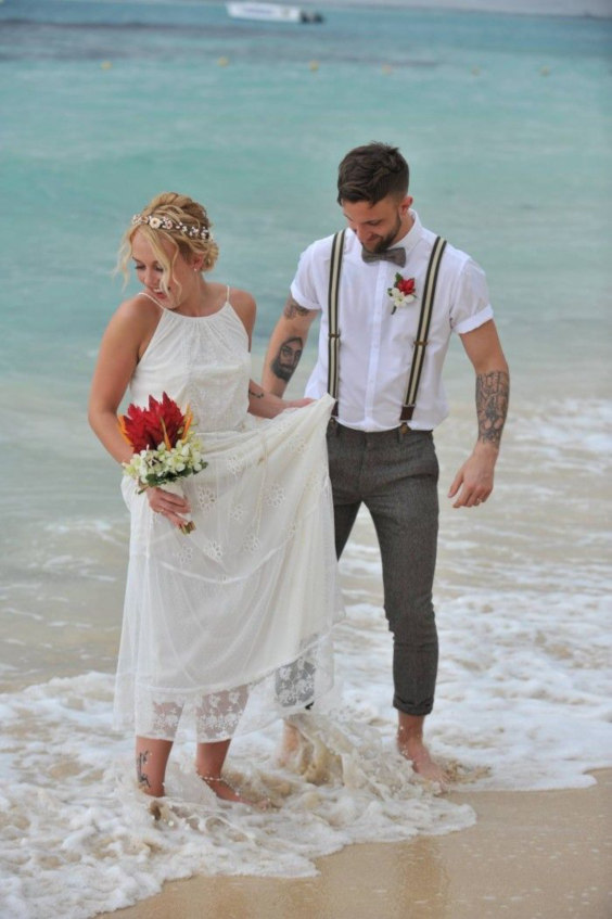 Como eu disse, o casamento boêmio pode dá preferência a lugares abertos e próximos a natureza e a praia não está excluída da lista. Você tem aí duas opções: a primeira é partir para um look praiano, com linho e algodão predominando, ou algo mais exótico com o exemplo da foto, então capriche nos acessórios e experimente incluir uma peça com um padrão clássico bem vistoso.