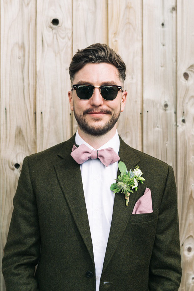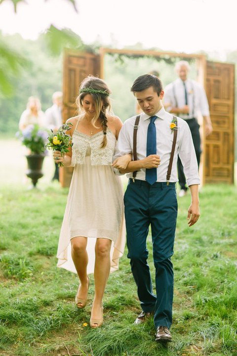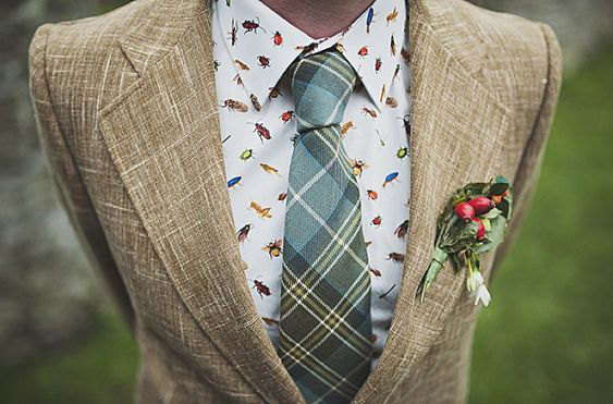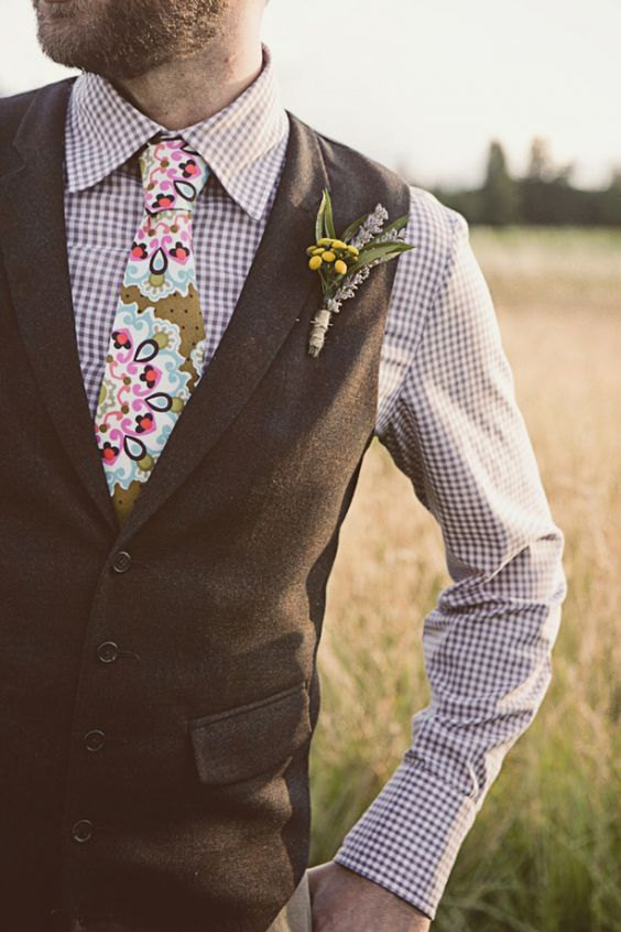 Tecidos de mescla sempre remetem ao visual rústico e combinam bem com o bohemian wedding, além de deixar o look mais interessante. A gravata borboleta também remete ao vintage, e escolher uma estampa bacana só deixa o acessório mais bacana.