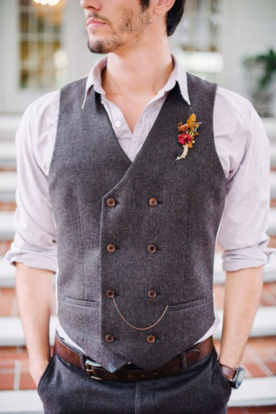 É quase uma regra nesse tipo de casamento, e te nho que concordar que combina bem com o tema. Dá para usar por baixo do blazer ou totalmente aparente, sem o casaco, fazendo par com a gravata borboleta.