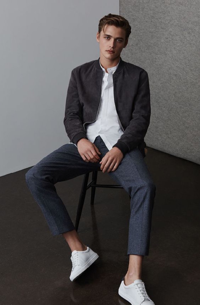 As jaquetas devem ser simples e com pouquíssimos detalhes. Modelos clássicos como a bomber ou a varsity sem bordados ou muitas cores funcionam muito bem.
