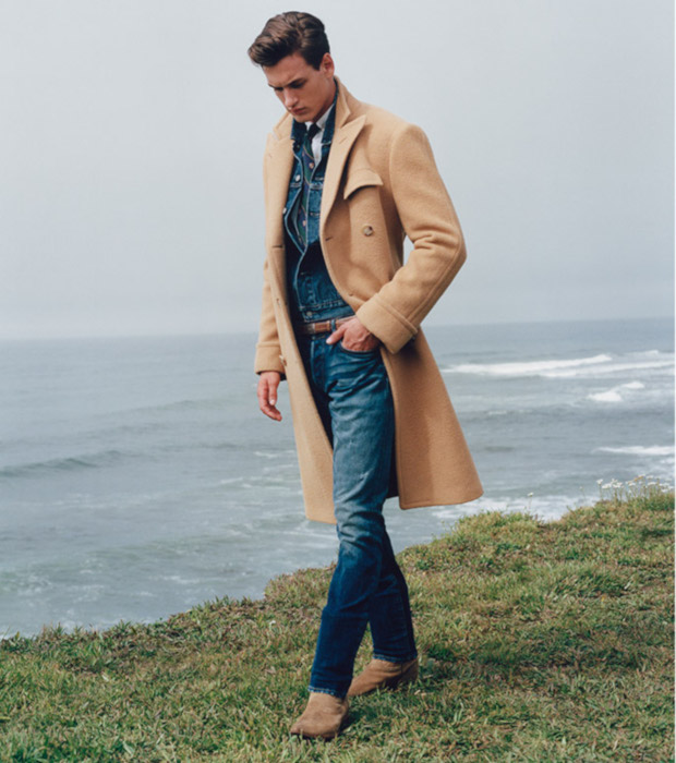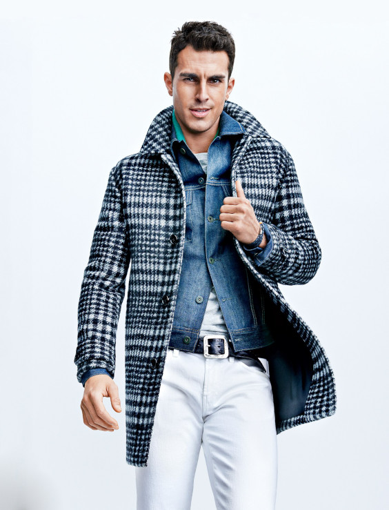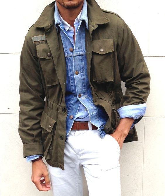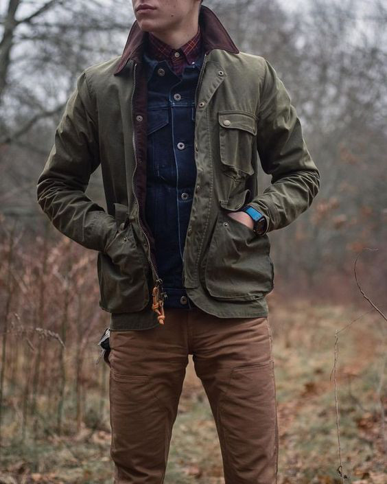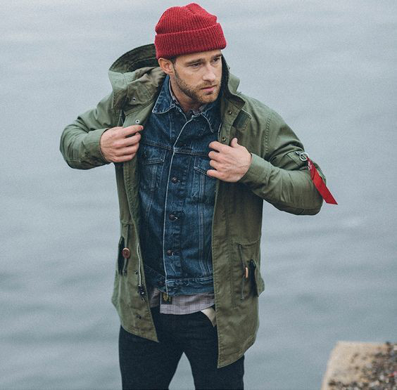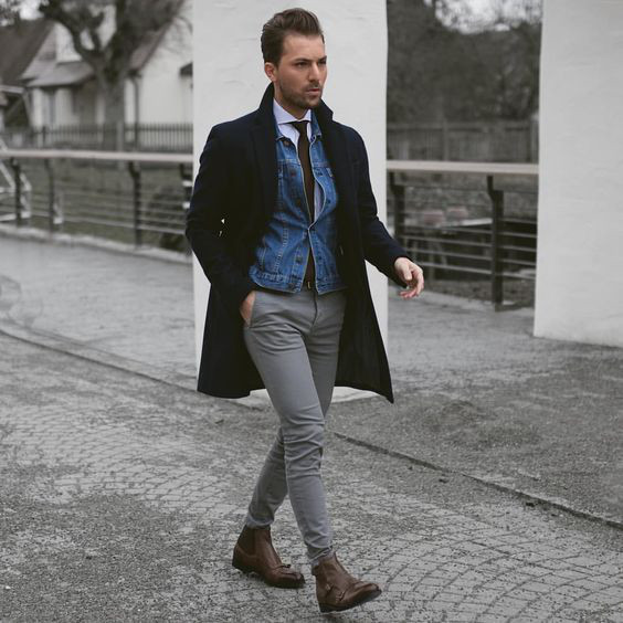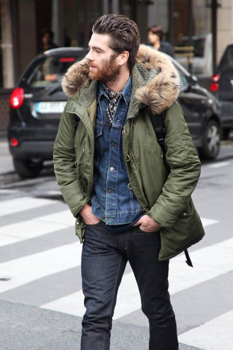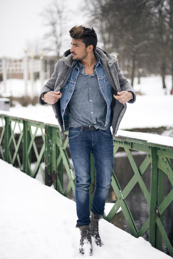 Um dos usos mais comuns da jaqueta jeans nesse caso é para criar uma base double jeans que será quebrada pelo casaco ou parka, geralmente em tons de marrom, vinho, bege ou verde.