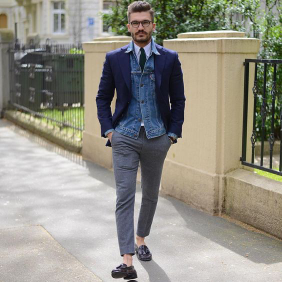 Aberta ou abotoada, a jaqueta jeans também pode ser usada com costume ou blazer em uma combinação com ares de transgressão, principalmente para quem acha que o traje social é intocável. Para manter o clima, escolha um par de tênis de couro branco com design clean.