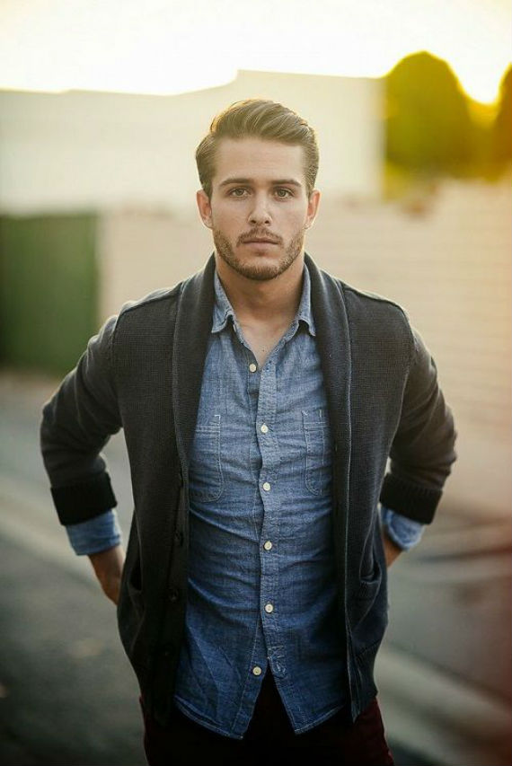 Este tipo de camisa da um toque especial a produção quando sobreposta por um suéter leve. A textura da gola, aparecendo discretamente, contrasta com as malhas neutras e chama atenção para o rosto. Com peças de cor forte a camisa de chambrê masculina serve para tirar um pouco do excesso e deixar o visual discreto.