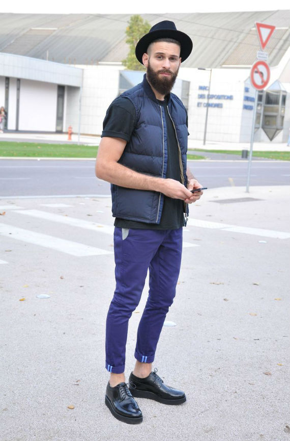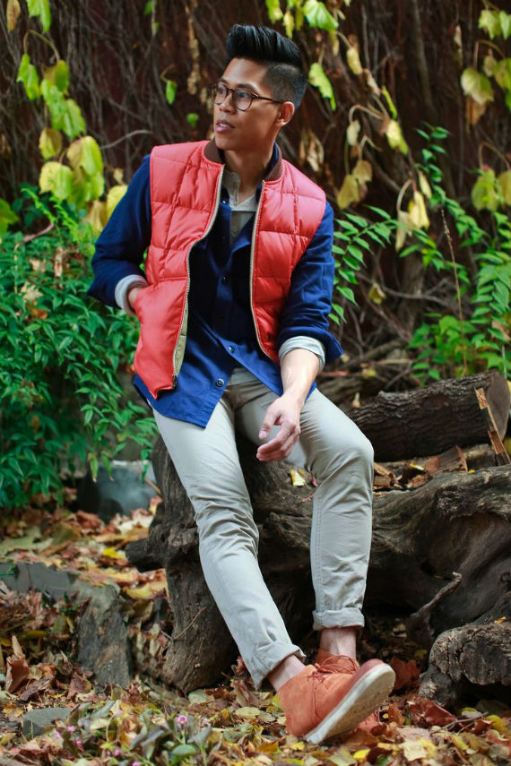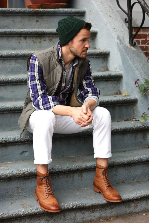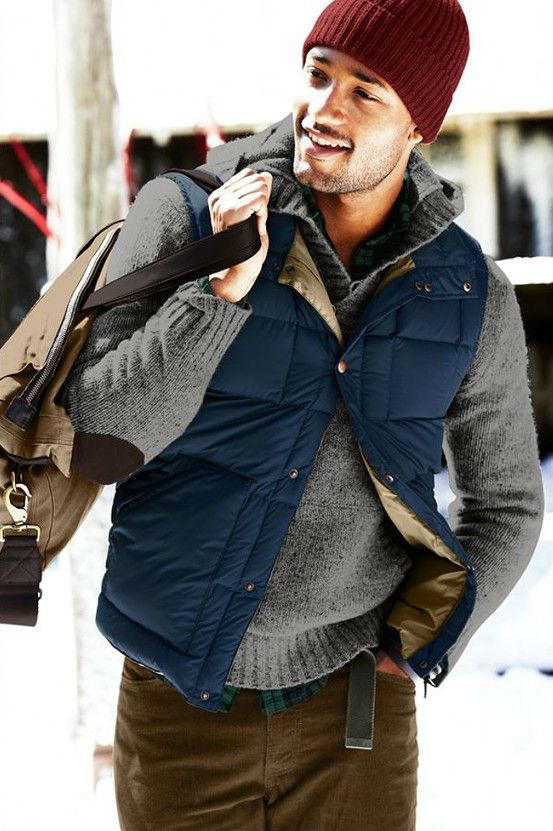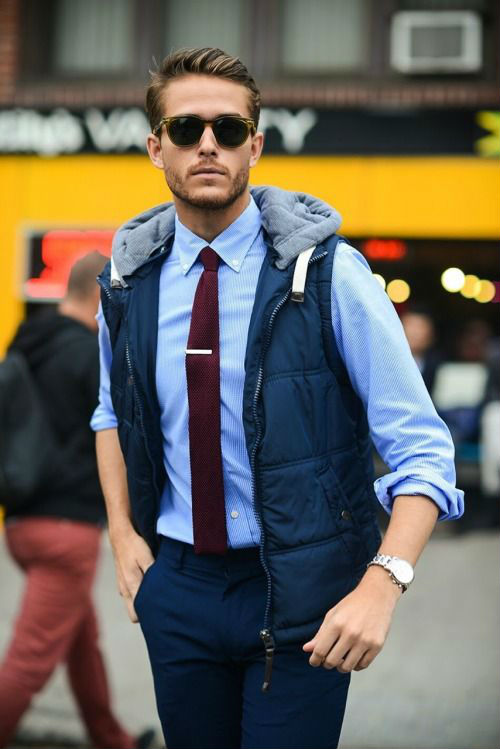 As vezes pode ser uma boa dar uma quebrada no visual do jeans, ainda mais se você tem uma peça com uma cor que de um bom contraste e chame atenção para seu rosto, como este exemplo acima. Outra opção são os coletes esportivos em tons de marrom, vermelho e bege.