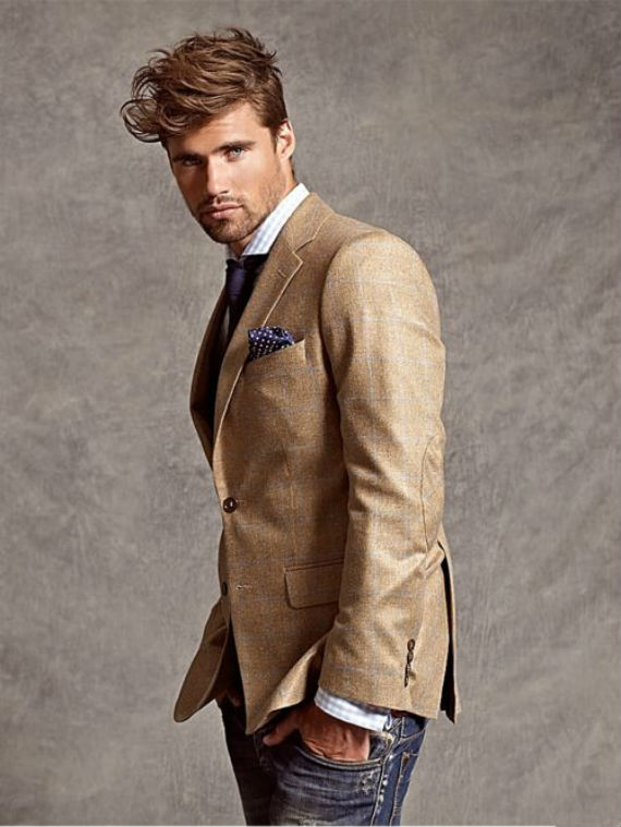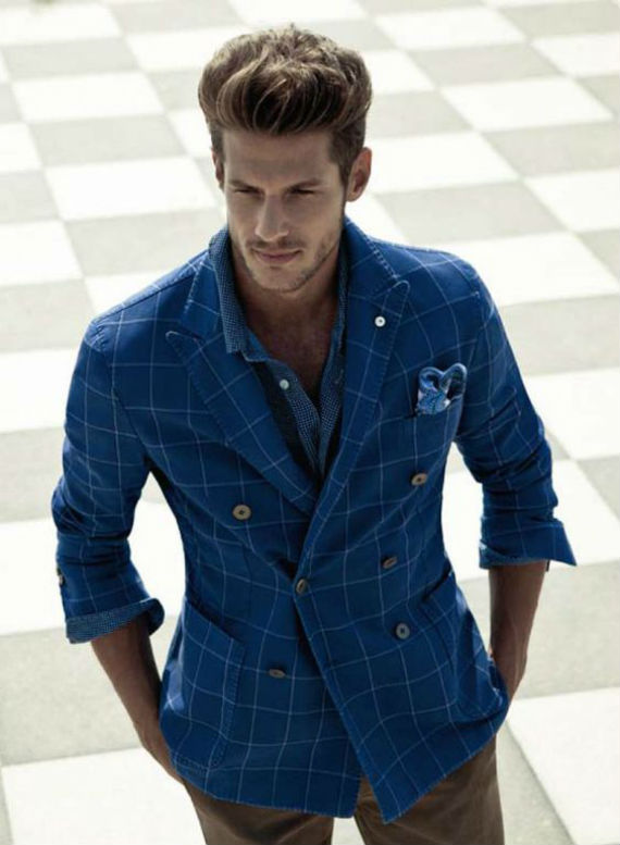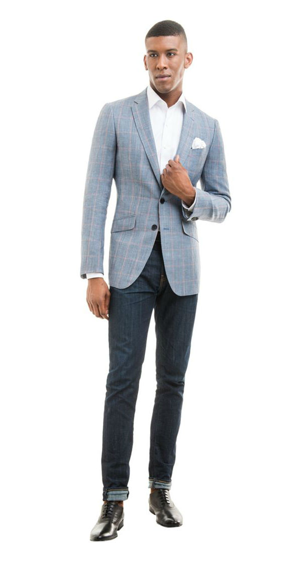 O blazer de abotoamento duplo com window pane pode parecer muito sério, mas você pode usar peças descontraídas para fazer um look casual e descolado. Um jeans surrado e um sapato casual podem ajudar na tarefa.