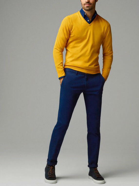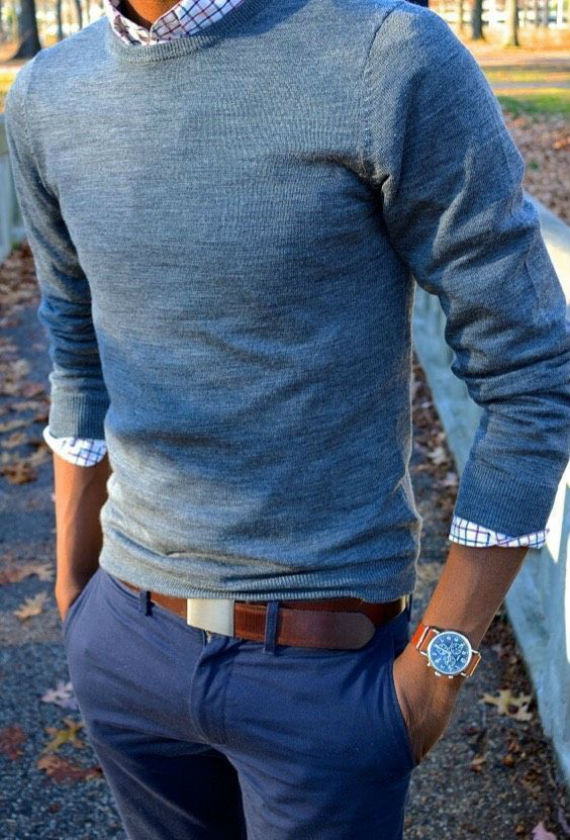 Você já usou a mesma combinação de calça e camisa xadrez pela enésima vez? Jogue uma malha em cor contrastante por cima para ressaltar o xadrez e chamar atenção para seu rosto.