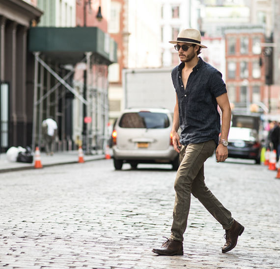 Nem a bela bota conseguiria tirar essa combinação do básico se não fosse o chapéu Fedora. O complemento faz com que o visual, apesar de simples, ganhe um toque moderno e jovem, capaz de circular por locais onde a informalidade é a regra. Por outro lado também é possível criar algo mais alinhado com peças de alfaiataria, mesmo que seja apenas camisa e calça social.
