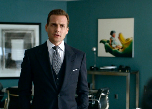 A escolha do corte do terno não poderia ser mais adequada: seu corte tradicional mostra que o cargo de Harvey exige uma boa vestimenta, mas não dá lugar a concessões ou modernismos, principalmente para quem trata com figurões a todo o momento e quer ser levado a sério. As camisas com golas italianas e francesas combinam bem com o rosto quadrado do ator Gabriel Macht e as gravatas clássicas com nós volumosos como o Windsor ajustam-se perfeitamente ao seu tipo físico.