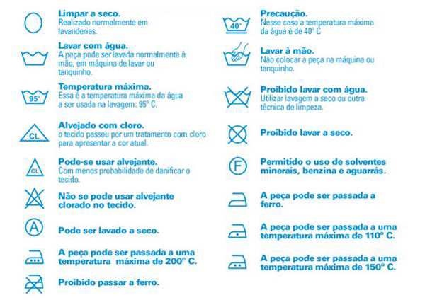 - e, para finalizar nossas dicas, fique atento sempre às instruções de limpeza da peça, para entender melhor o que cada símbolo significa, siga as istruções da imagem abaixo.