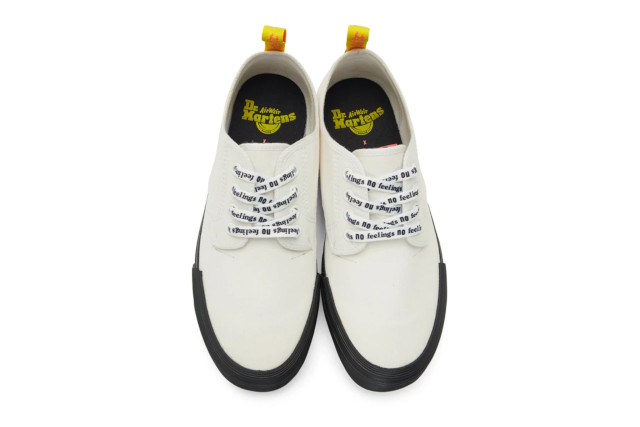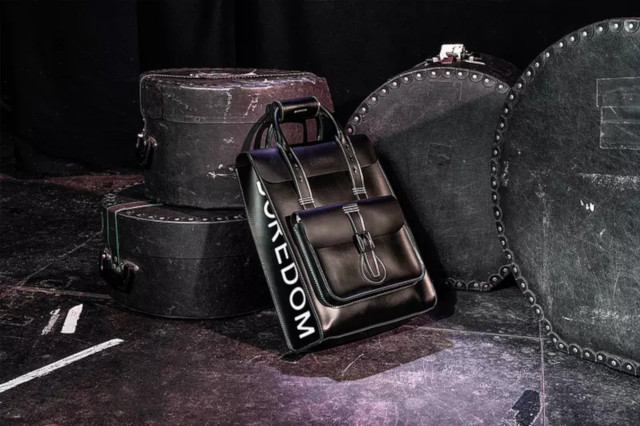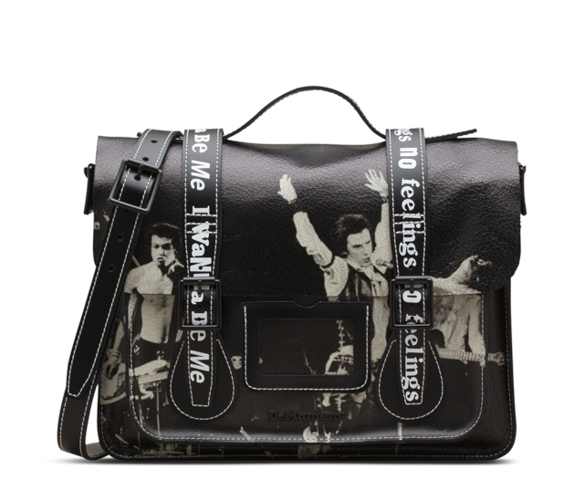 A Dr. Martens não só criou coturnos incríveis que trazem fotos da banda estampadas e letras de suas músicas, como também aproveitou para fazer sapatos, camisetas, cadarços, tênis e até bolsas de couro masculinas que dificilmente vão passar despercebidas, tanto por seu design, quanto por suas estampas estilosas. O visual se baseia no trabalho de Jamie Reid para a capa do álbum “Never Mind the Bullocks” dos Sex Pistols.