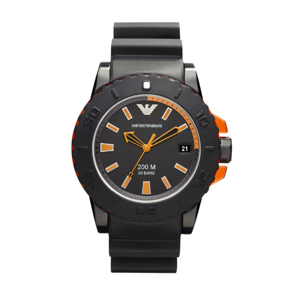 O robusto modelo é todo preto, com caixa de aço, catraca esportiva e pulseira de borracha. O mostrador é minimalista, combinando com perfeição com o restante da peça, inclusive com os protetores do botão de ajuste, em acrílico. Mas o que faz deste modelo único na linha de relógios da Emporio Armani é o fato de ser resistente a até 200 metros embaixo d’água (20 ATM), tornando-o ideal para quem adora esportes aquáticos.