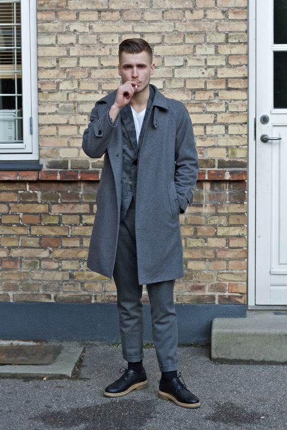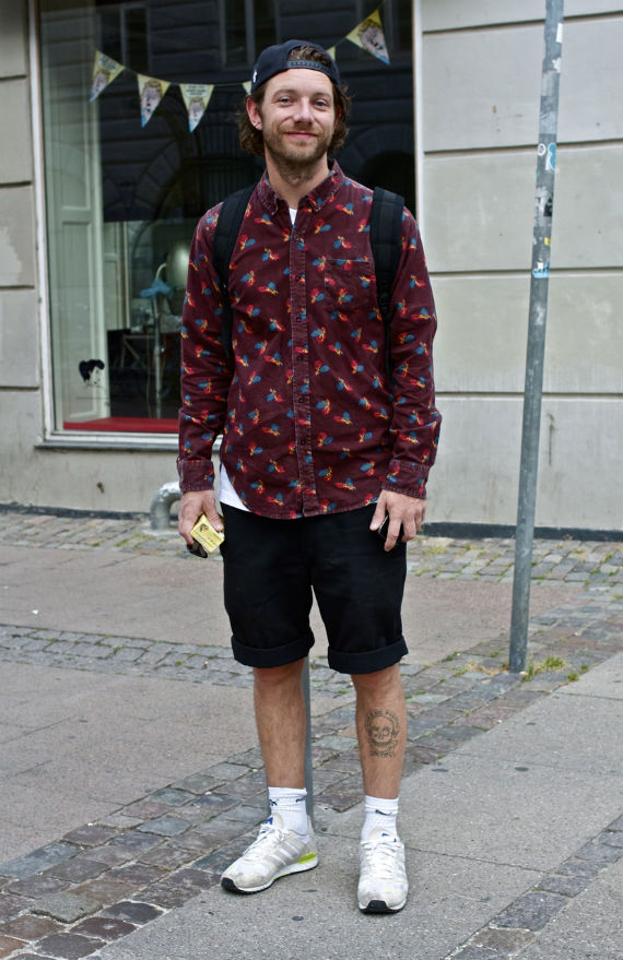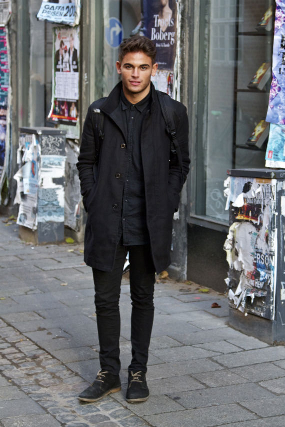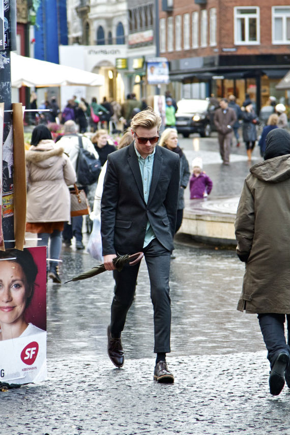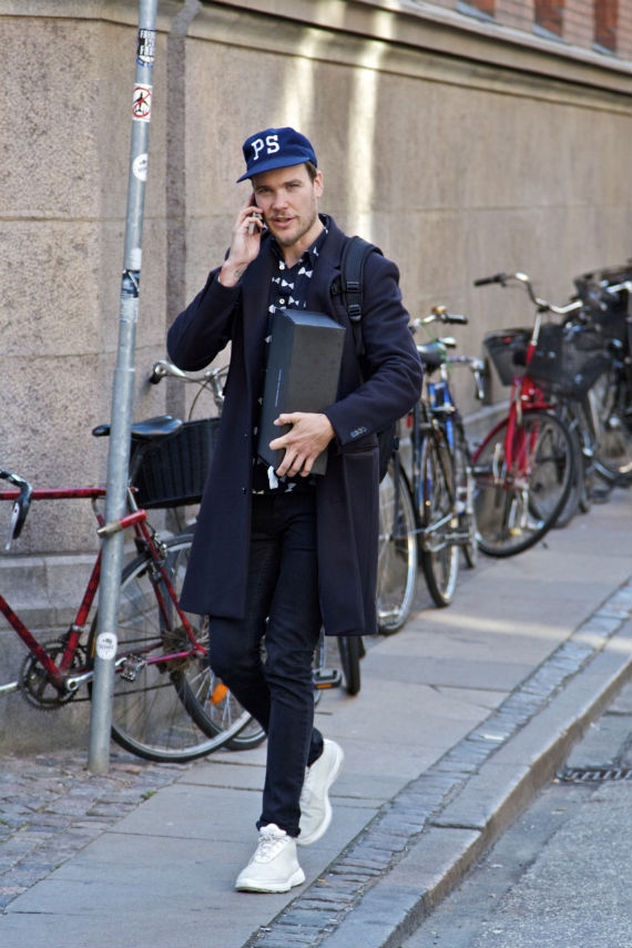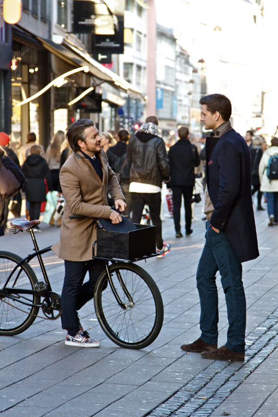 Estima-se que até 2015 metade das pessoas usarão a bicicleta como transporte para o trabalho, esse tipo de atitude influência a escolha das roupas e dos acessórios do dia a dia.Mesmo de bike existem aqueles que não perdem a linha, fazendo questão de manter a camisa muito bem arrematada por uma gravata borboleta.Ao contrário de outras cidades europeias onde os homens fazem questão de investir em combinações de cores ousadas, o Dinamarqueses gostam mesmo é de roupas pretas e cinzas, com um toque de azul ou marrom de vez em quando.Parece que eles investem mesmo nos bonés e tênis estilosos, muitas vezes até chamativos, deixando o resto neutro.Outro acessório que é quase obrigatório é a mochila, mais até do que as bolsas e as pastas, algo compreensível em uma cidade onde muita gente se desloca de bicicleta.As jaquetas parecem não fazer muito sucesso, mas os casacões são muito comuns e a maioria tem o comprimento entre metade da coxa e o joelho.Dá para notar que os homens dessa cidade prezam por roupas confortáveis e funcionais, mas que protejam do frio intenso da região.Seja com os populares bonés, chapéus ou toucas, a cabeça está sempre protegida