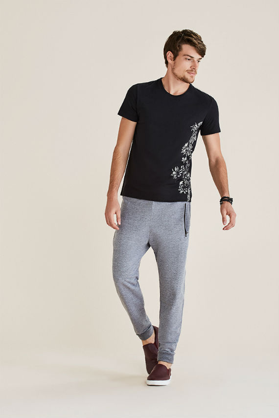 - Pequenas estampas ficam na parte de baixo, na de cima, sobretudo em camisetas, as estampas são grandes, mas monocromáticas para manter uma certa discrição.