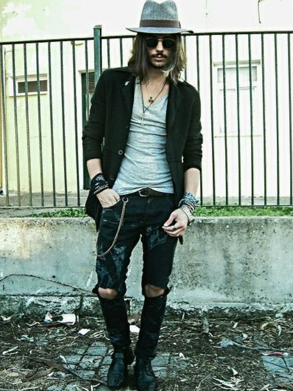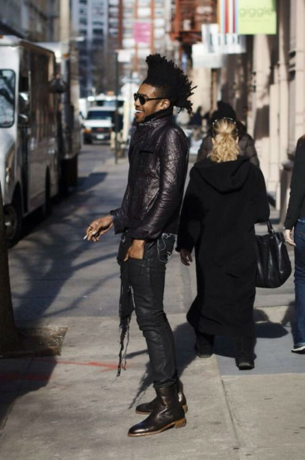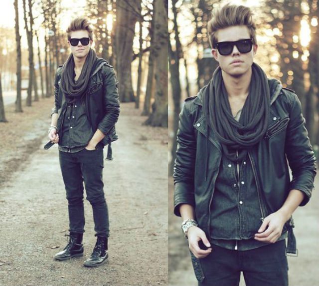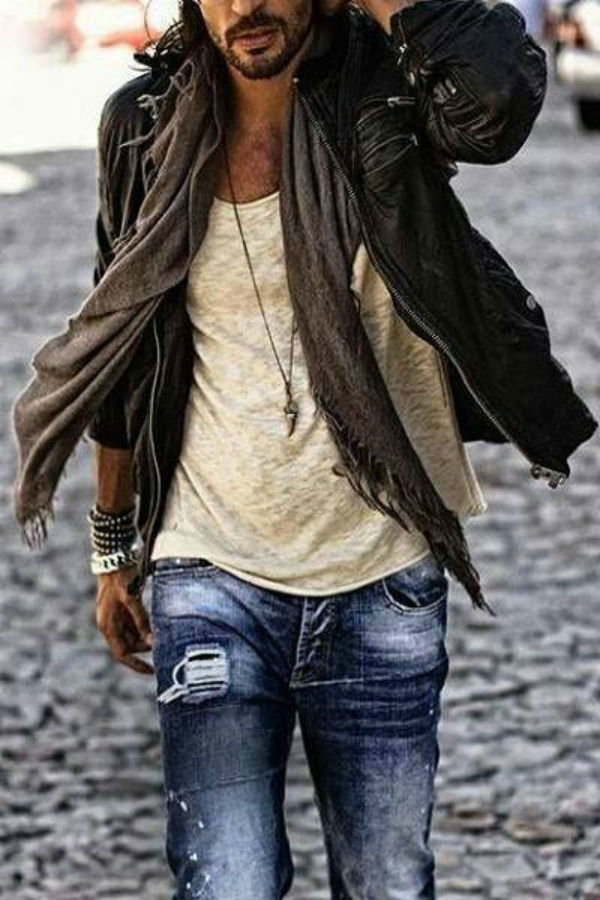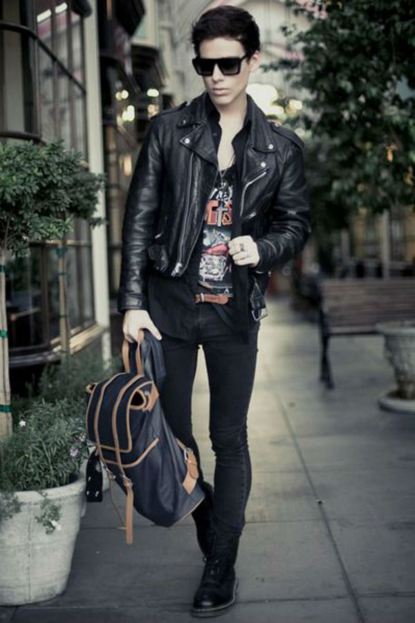 É impossível vestir uma jaqueta de couro e não trazer um pouco da rebeldia do rock para o look do dia a dia, mas aqui também temos a calça skinny, a bota e a echarpe pendendo no pescoço e não vamos esquecer o cabelo mais longo e desgrenhado.