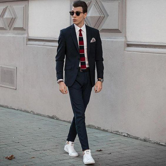 Uma excelente opção para o amigo roqueiro de escritório que quer um look ousado, mas que mostra respeito pelo local de trabalho. Para evitar exageros fique com uma camisa bem comportada e um jeans escuro, uma chino marinho ou calça de alfaiataria cinza, combinando com calçados elegantes.