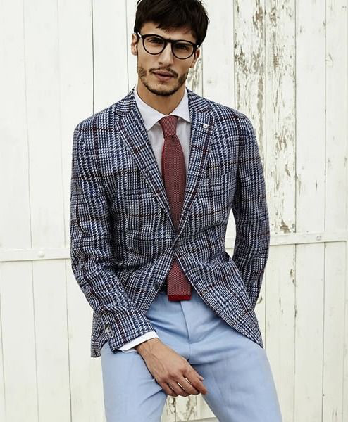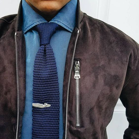 Tecidos com visual mais rústico também são uma boa opção para combinar com esse acessório, mais uma vez se equilibrando entre o sofisticado e o casual. As camisas jeans ou com um tecido um pouco mais leve, o chambray (ou chambrê)- mas cujo efeito visual é bem parecido – ficam perfeitamente alinhadas com a proposta da gravata de tricô, permitindo aí uma imensa gama de combinações no que diz respeito às outras peças, mas se a ideia é ficar na mesma vibe eu diria que um blazer de algodão para o trabalho (como na foto) ou uma jaqueta/casaco de sarja são uma sacada de mestre.