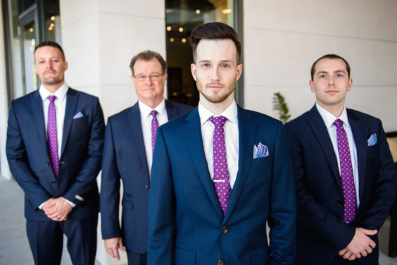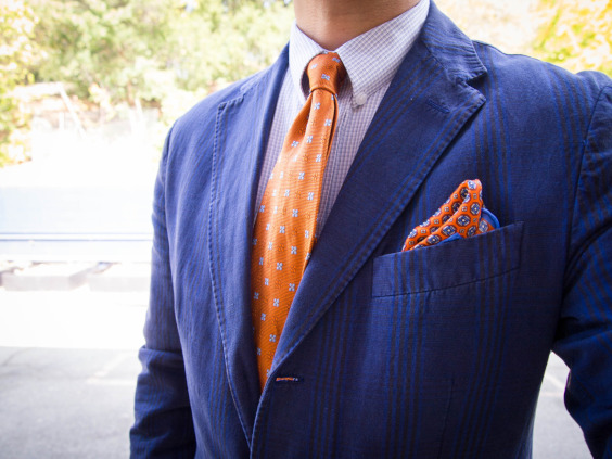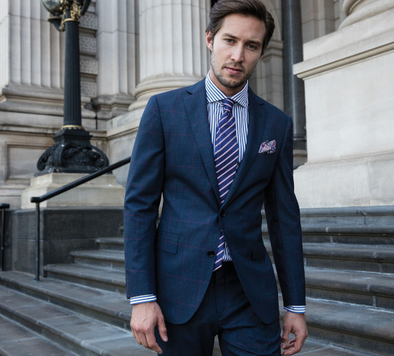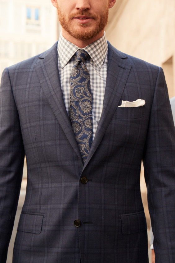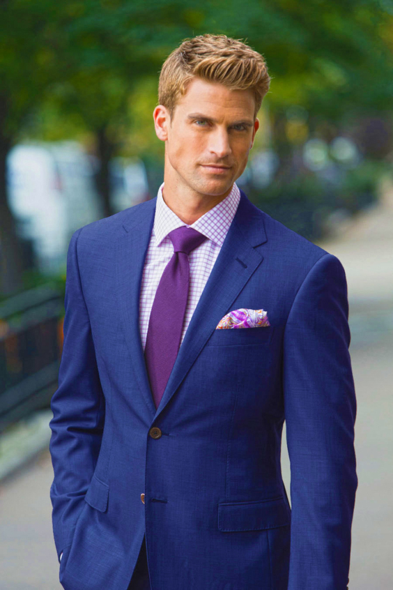 Gravatas listradas podem deixar o visual mais interessante, assim como uma camisa xadrez que misture tons de azul ou que seja predominantemente azul, mas tenha discretas linhas brancas (xadrez tipo grid). Se você tem dúvida quanto a gravata, escolha uma como a da foto, que não foge a palheta de que já existe no traje ou que traz cores neutras, além do roxo ou qualquer outra matiz que tenha escolhido.