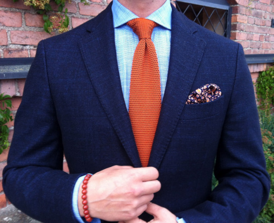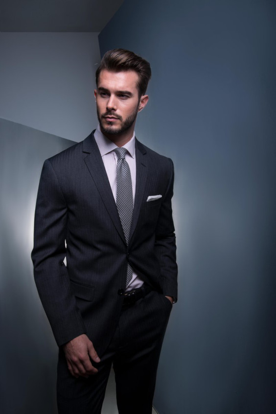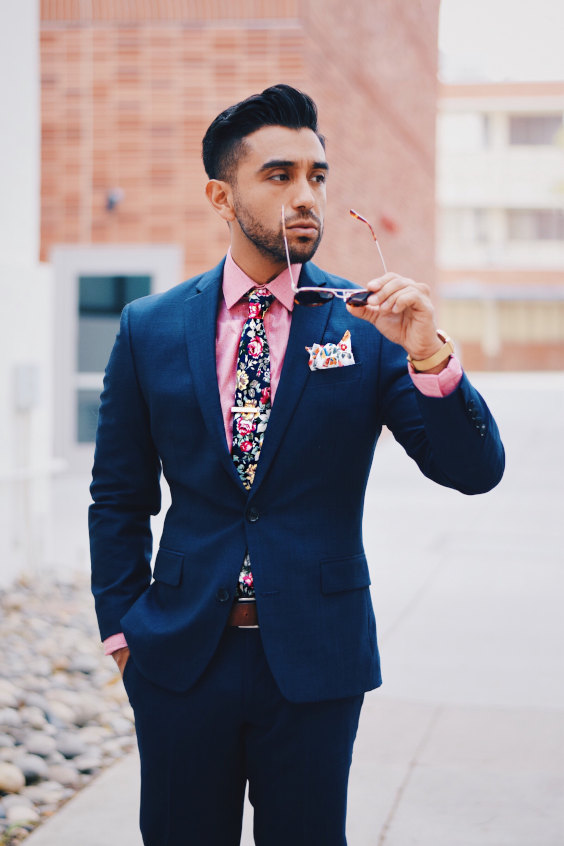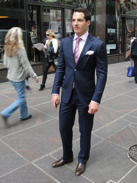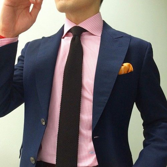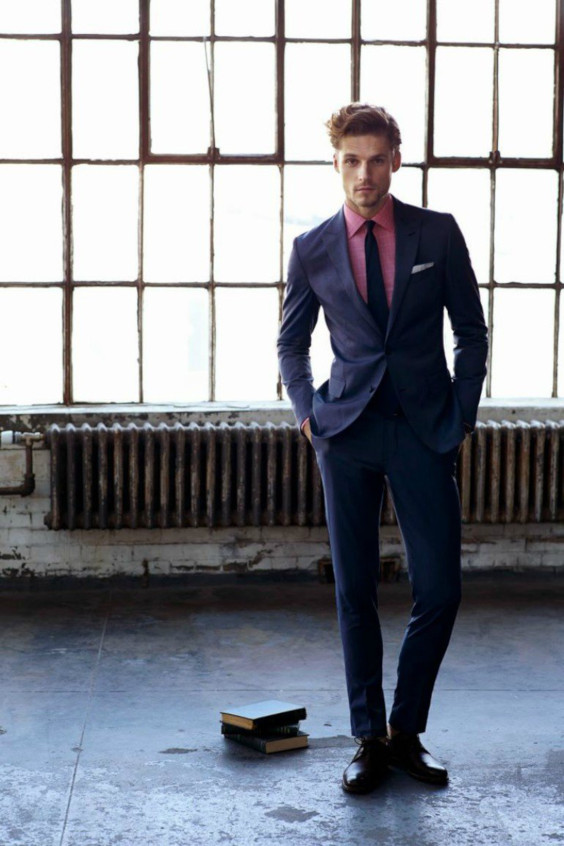 Você já havia pensado em misturar cinza com rosa acompanhando um terno marinho? Não? Nem o autor do traje acima! O fotógrafo usou um filtro que deixou a camisa branca acinzentada. Mas não é que ficou bom?