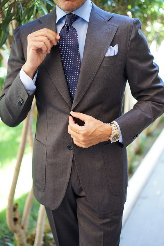 Quando a escolha é um traje neutro como o terno cinza, cores são problemas menores, então você deve pensar mais em composição de estampas e a quantidade de tons escuros presentes no conjunto.