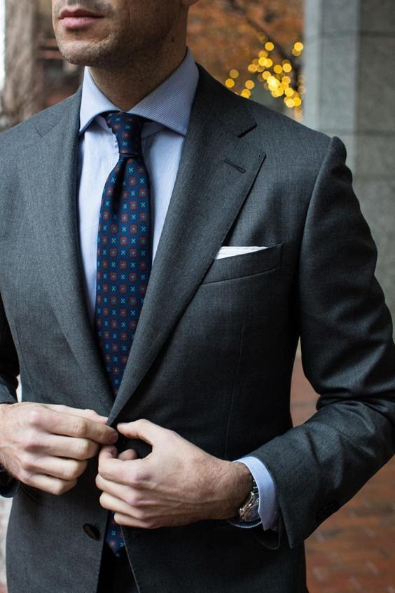 A gravata pode ser em um tom mais escuro que a camisa ou algo que contraste com o marinho, ou neutro, como o preto. Ela também pode ser cinza, mas neste caso aconselho que tenha listras ou estampas para deixar o look mais interessante.