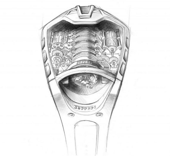O design do MP-05 LaFerrari inspirou-se nos motores V12 da montadora italiana, resultando em um visual extremamente diferente para um relógio, mas que provavelmente deixará os fãs de automobilismo loucos! Composto por 637 peças acionadas por corda que pode durar até 50 dias sem parar, o relógio possui no centro de seu mostrador onze cilindros responsáveis pela movimentação do mecanismo, a direita, anéis de alumínio anodizado marcam as horas e a esquerda é possível saber quanto ainda resta de energia. O vidro é feito de cristal de safira e dá uma boa visão do amplo e exótico mostrador, tudo isso protegido por uma caixa de titânio e carbono que remete imediatamente às formas dos carros da Ferrari.
