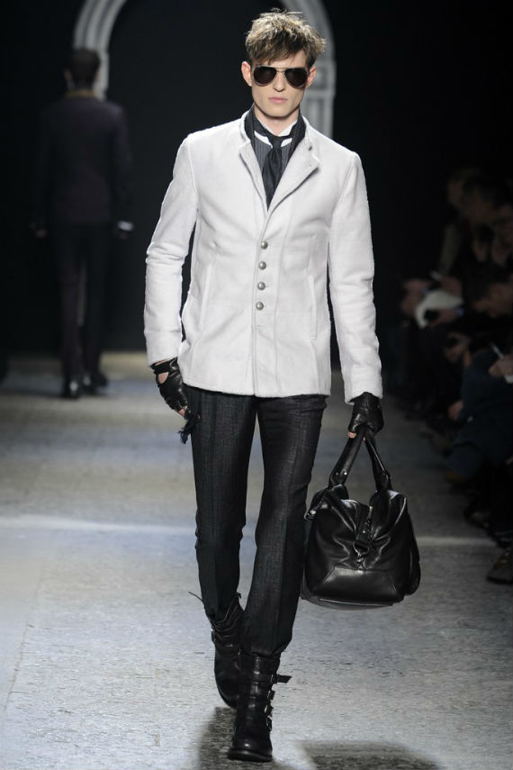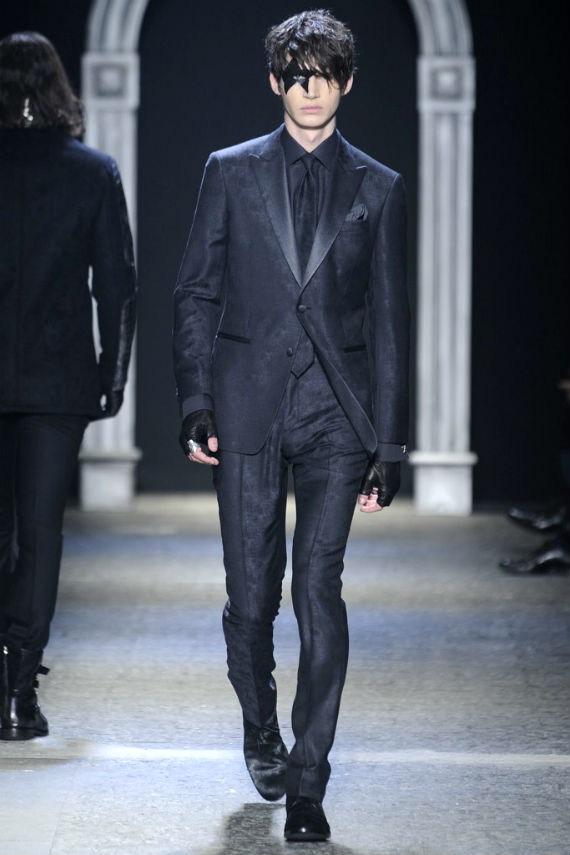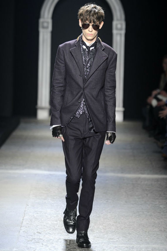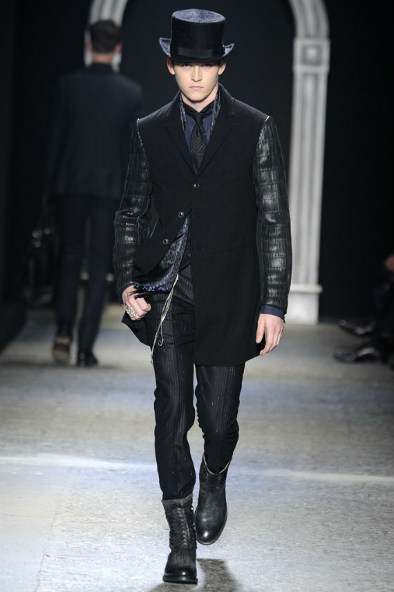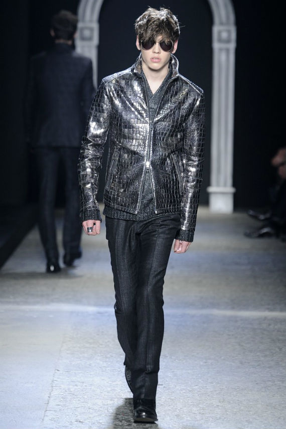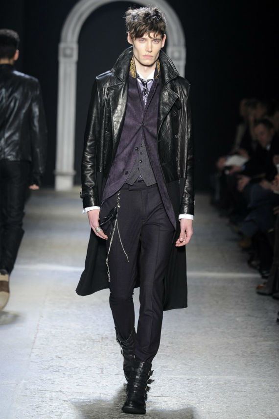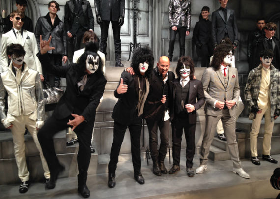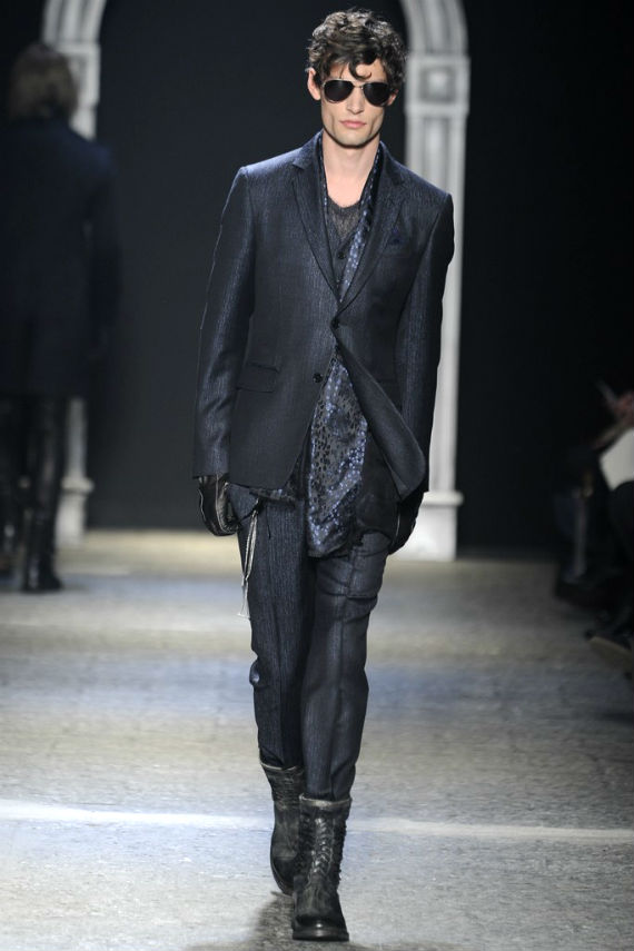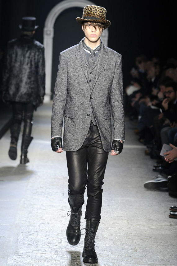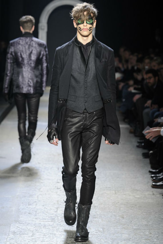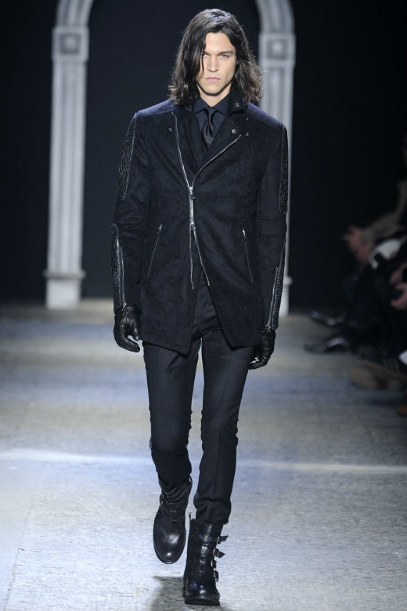Inspirado no universo gótico, com direito a cenário imitando castelo medieval, John Varvatos desfilou seu outono/inverno 2014 em Milão e mais uma vez mostrou que seu estilo roqueiro anda de mãos dadas com a elegância. Em mais de uma oportunidade vemos peças de alfaiataria combinadas com jaquetas e casacos de couro dignos dos maiores astros do rock, que, aliás, deram as caras no final do evento, afinal o estilista conta com os integrantes do Kiss, uma das maiores bandas de todos os tempos, como garotos propaganda desta coleção e é óbvio que eles não poderiam ficar de fora em uma ocasião como essa!
