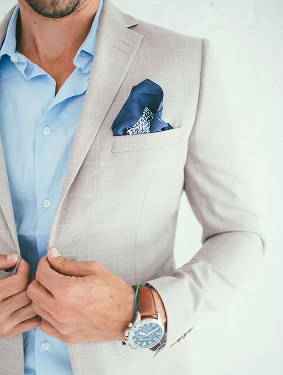 Acessórios – lenços brancos de algodão ou linho para o bolso, abotoaduras, prendedores de gravata, relógios clássicos com pulseira de couro.