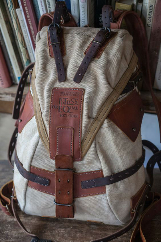 Mas o que deve ser levado em consideração mesmo é a habilidade de Nikita para criar bolsas e mochilas misturando couros de diversos tons, feltro, lona e detalhes de metal. Alguns modelos são intrincados, envolvendo diversas tiras de fechamento e um trabalho no couro caprichado e minucioso. Nota-se que o cara ama o que faz!