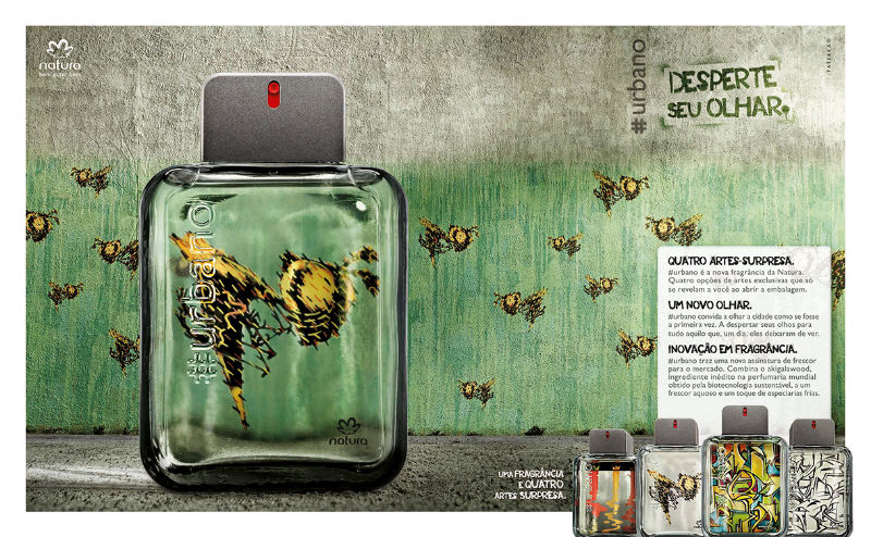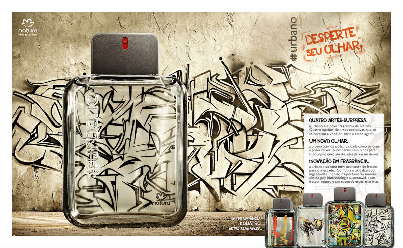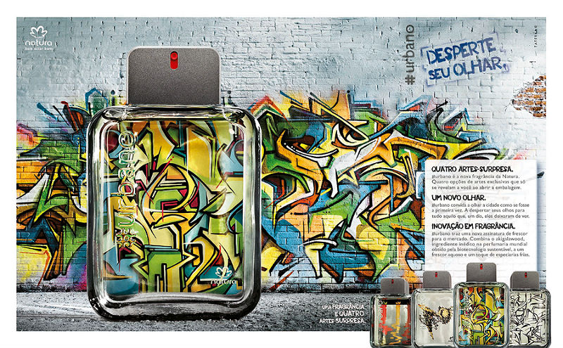 O frasco do perfume também dialoga com o homem da cidade, trazendo 4 versões com imagens exclusivas criadas por 3 artistas urbanos – Does, Paulo Ito e Izu – que emprestaram seu olhar contemporâneo para comunicação visual do produto, com um dado interessante: o consumidor só descobrirá a ilustração de seu #urbano depois de comprá-lo, pois só é possível vê-la com a caixa aberta! A intenção da Natura é surpreender o público, assim como somos surpreendidos todos os dias pela arte nas ruas.