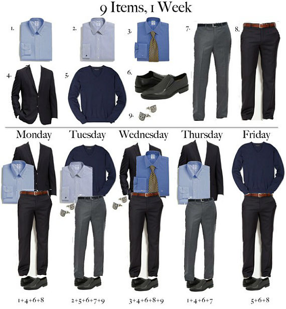 Saber coordenar suas roupas de maneira inteligente é a chave para gastar pouco e obter o máximo de rendimento de seu guarda roupa. Planejando corretamente quais itens comprar e como usá-los é possível vestir-se durante uma semana de trabalho com apenas nove peças sem repetir a combinação como prova a imagem abaixo.