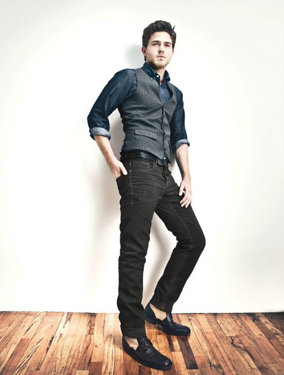Usar um colete com um xadrez Príncipe de Gales ou Window Pane que tem um visual mais clássico e interessante, ou uma camisa em cambraia que tem aparência similar ao jeans mas é mais fresca e leve. As botas poderiam ser trocadas facilmente por um coturno todo preto ou por uma work boot marrom escuro.