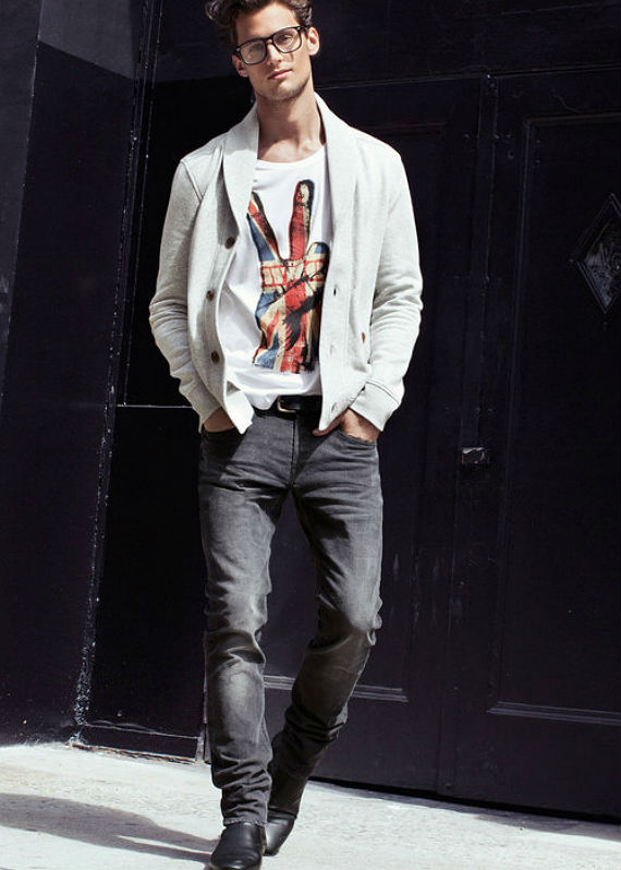 Uma camiseta como essa em uma combinação muito rebuscada não faria diferença, mas aqui ela dá um toque descolado e colorido a um look que poderia ser monocromático. O jeans tem boa lavagem, sendo bem adequado ao estilo do visual e o casaco dá um ar mais alinhado que é complementado pelo sapato em couro preto. O óculos é um detalhe geek, mas não obrigatório.