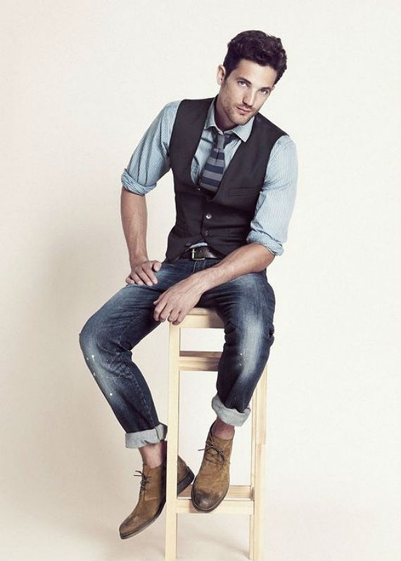 Na verdade é tudo muito simples e relax: um jeans com lavagem bacana, uma camisa comum de listras, o sapato de aparência surrada fazendo a rima com a calça, a gravata que tem listras largas para não brigar com a camisa e o colete para fechar com elegância. Além disso look abusou do azul e dos neutros, sem nenhuma cor muito arrojada ou chamativa.