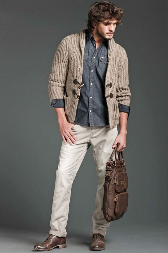 A camisa jeans (na verdade em chambray) é o que impede que a combinação fique insossa, e faz o contraponto perfeito com a calça bege e o casaco, mas os detalhes também contam: do método de fechamento do tricô, a cor dos sapatos e da bolsa, passando pela dobradinha estratégica na barra e nas mangas, tudo está ali para enriquecer o resultado final.